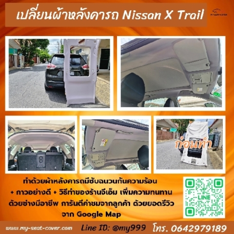 รีวิวทำเพดานรถยนต์Nissan X-Trial รับเปลี่ยนผ้าหลังคารถยนต์ (ตัวอย่างบางส่วน) ผ้าหลังคารถ Nissan X-trial ผ้าเพดานรถหย่อนย้วย ห้อยย้อย หลุดร่วง พอง ตกท้องช้าง กาวทำผ้าเพดานรถ เสื่อมสภาพ แก้ไขได้ รับทำฝ้าเพดานรถ หุ้มผ้าฝ้าหลังคารถ