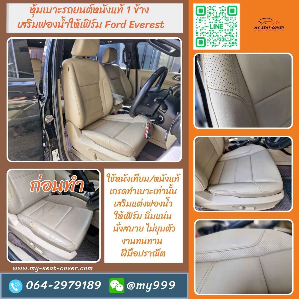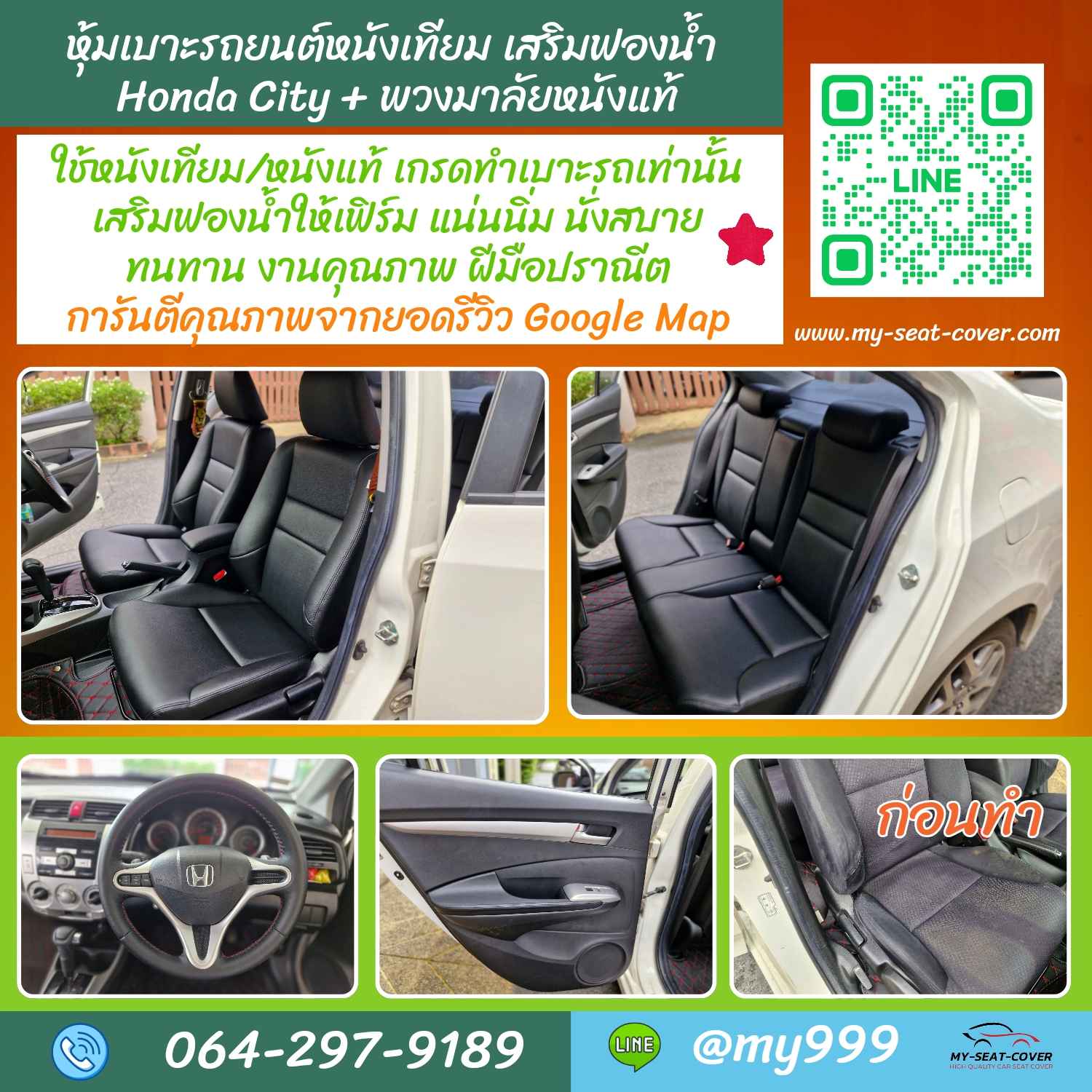 รีวิวผลงานหุ้มเบาะรถยนต์ ร้านรับทำ หุ้มเบาะรถยนต์แบบถาวร หุ้มเบาะรถยนต์หนังแท้ หุ้มเบาะรถยนต์หนังเทียม เสริมแต่ฟองน้ำให้เฟิร์มเหมือนเบาะรถยนต์ใหม่เหมือนออกกับโชว์รูม  ตัดเย็บด้วยวัสดุเกรด A เบาะหนังเทียม ใช้สำหรับทำเบาะหนังรถยนต์โดยเฉพาะ  เบาะหนังแท้ ใช้เกรด พรีเมื่ยม นอกจากนี้ร้านยังรับทำ เปลี่ยนผ้าหลังคารถยนต์ หรือ กรุผ้าหลังคารถยนต์ ด้วยการใช้ ผ้าบุหลังคารถยนต์ที่กันความร้อน เกรดที่ใช้ทำ Benz และ BMW หุ้มพวงมาลัยรถยนต์หนังแท้ หรือ หนังหุ้มพวงมาลัยหนังแท้ เย็บพวงมาลัยรถยนต์ รับหุ้มแผงข้างประตูรถยนต์ เป็นต้น สอบถาม โทร. 064-297-9189  / ไลน์ ไอดี 0642979189 แผนที่ร้าน https://bit.ly/3u6m6Xc